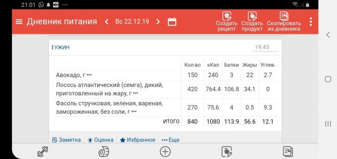 Настройки у меня по нулям, так что про запас еще 400 с небольшим калорий, ужин на полторашку многовато, но пофигу. Зато довольная и вкусно, захотела зверски авокадо, ну и сьела, целый одна поямо таки с жадностью. Я больше ничего есть не буду, места нет