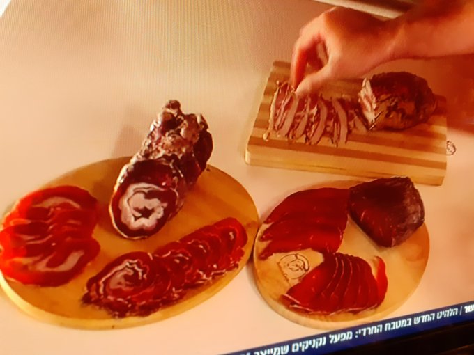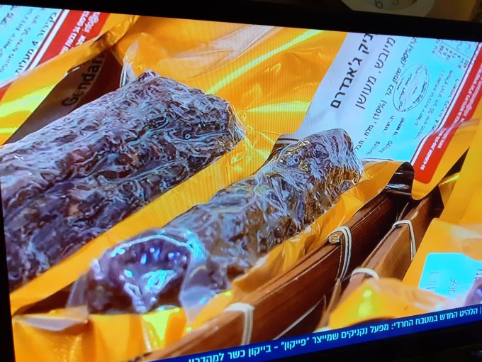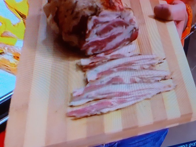 Только не падать со смеху, я вообще в обмороке, наши придумали кашерный бекон, из чего не знаю, понятно из мяса, пробовать не буду, но вот именно сейчас в праймтайм, все сидят у телевизоров(фотки с телека), мдяяяя. Передача смотримая раскрученная, ведущий из очень крутых. Отвисла у меня челюсть просто. Кашерность самого высого уровня.