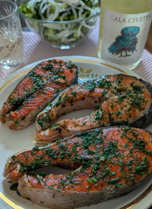 Наконец дошли руки купить красной рыбы. С самой Азии мечтаю о стейках. Были форель и нерка, счс сяду считать калорийность и что там по витамину Д. Не одной же селёдкой его набирать.