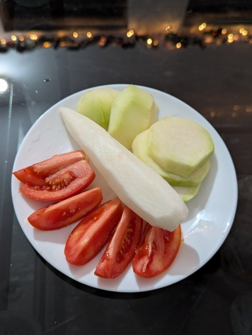Аппетит норм, сделала овощную тарелку - кольраби, дайкон, помидор. Вышло красиво, сфотографировала