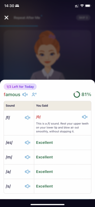 вам нужно повторить за диктором, и приложение дает разбор вашего