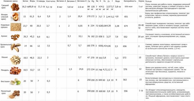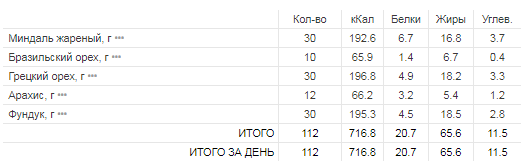 В штуках: арахис 10шт, миндаль 20шт, фундук 12шт, грецкий 30г,