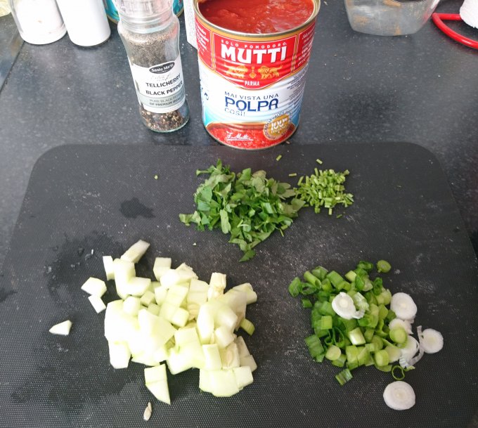На обед - ленивый гаспачо. Мякоть итальянских помидоров, огурец,