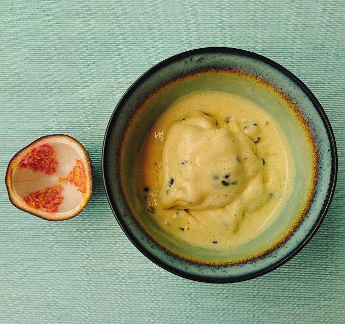 попробовала с маракуйей. Второй фрукт можно не замораживать.