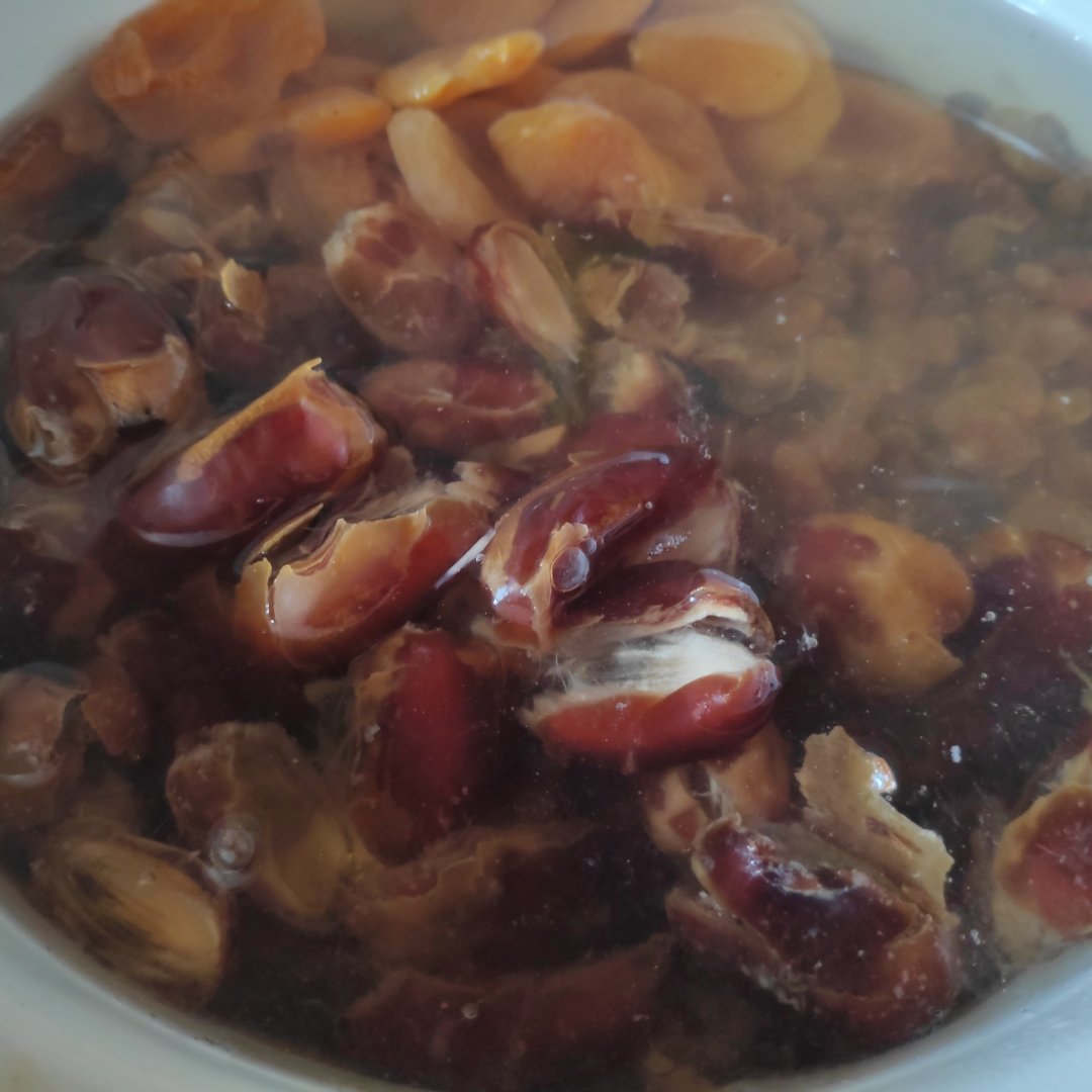 Сухофрукты (финики, курага, изюм) заливаем кипятком и накрываем крышкой, оставляем на 10-20 минут.