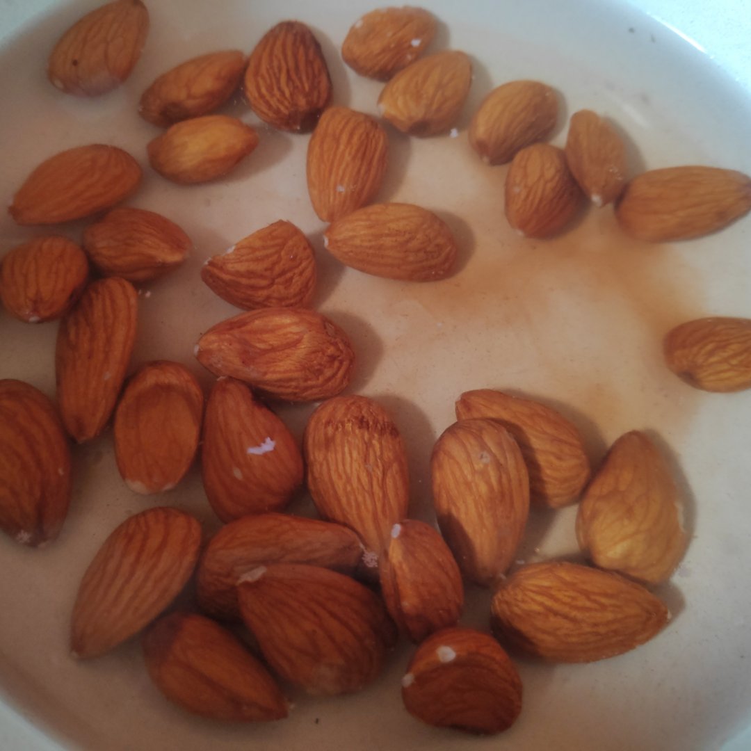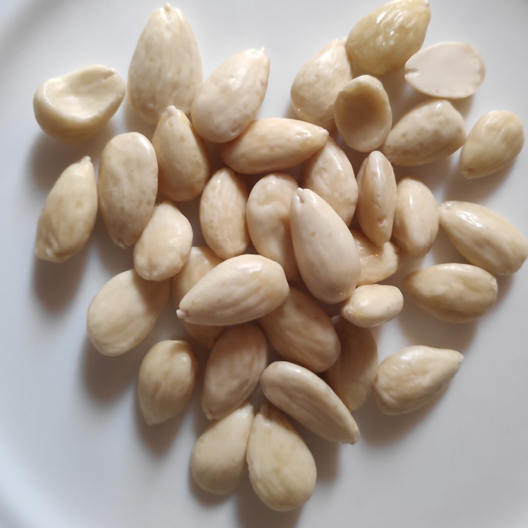 Если используете миндаль то тоже заливаем кипятком, примерно на 5 минут, по истечению которых кожица легко очиститься если надавить на орешек пальцами (аккуратно! орешки при этом могут куда-то улететь)