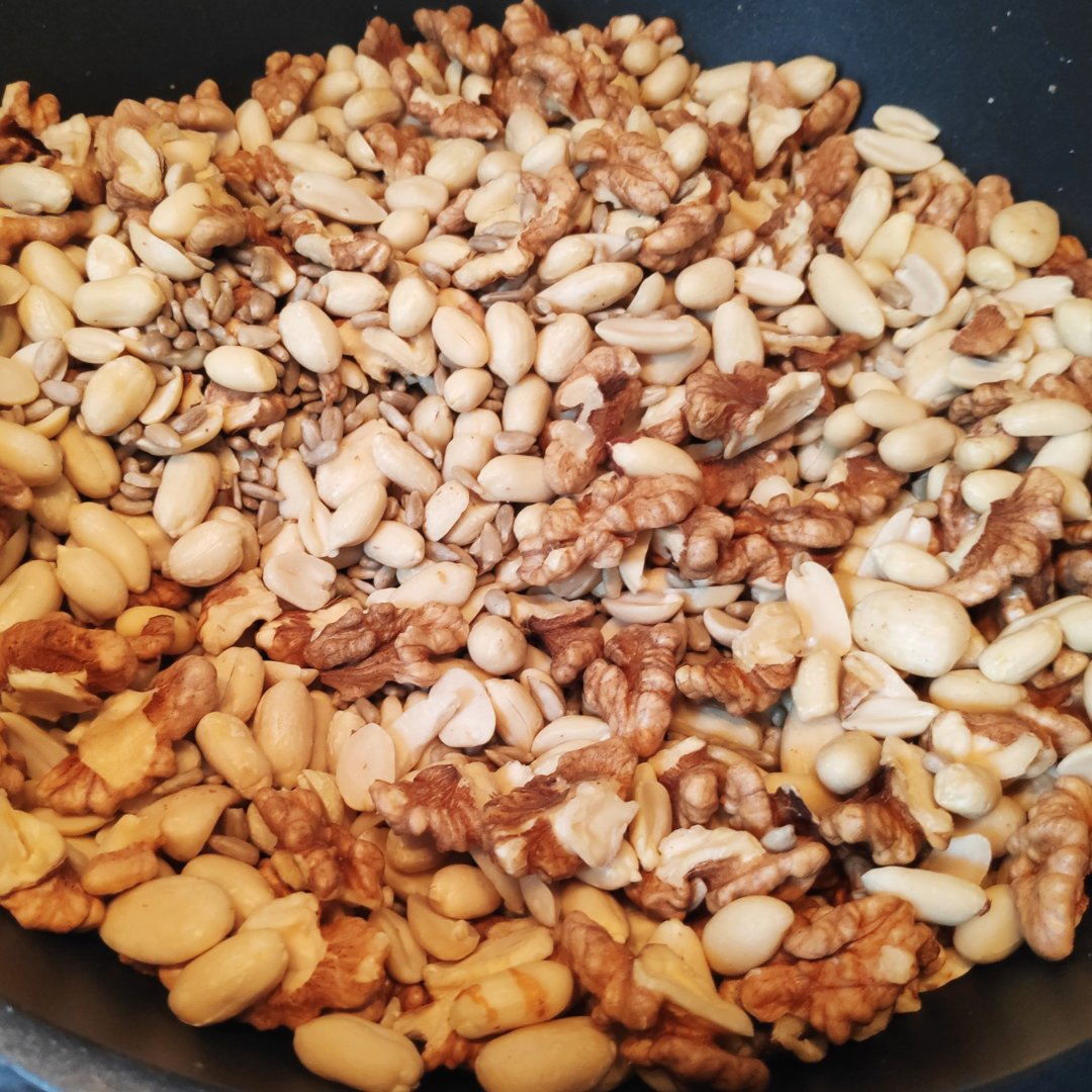 Все орешки и семена (арахис, грецкий, миндаль и семена подсолнечника, кунжут, мак) подсушиваем на сковородке на большом или среднем огне помешывая. Когда услышите аромат орехов поддариваем еще минут 2-3 и можно выключать.