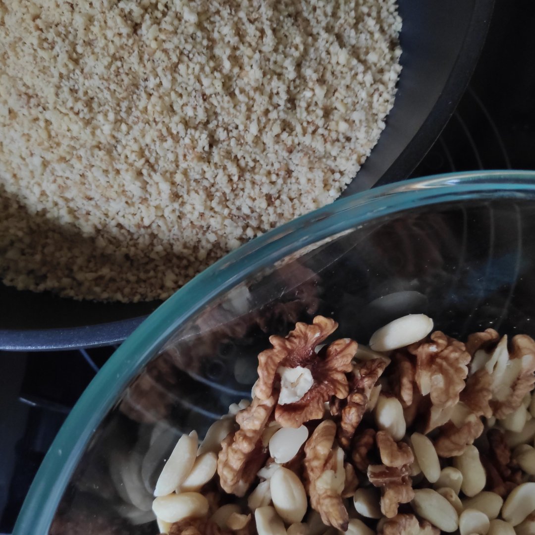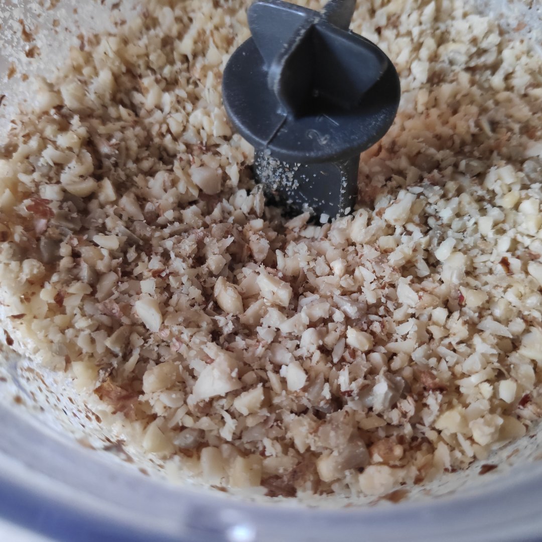 Измельчаем орешки. Я делаю это в блендере но можна и ножом. Мне не нравятся очень большие кусочки поэтому измельчаю поменьше.