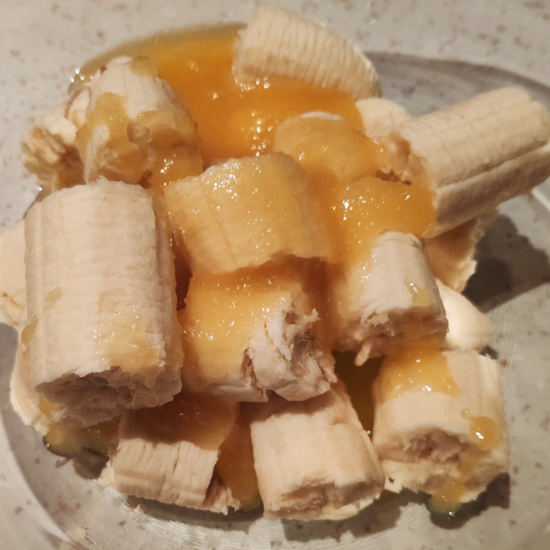 Добавляем мед в бананы и смешиваем до однородности блендером или вилкой.