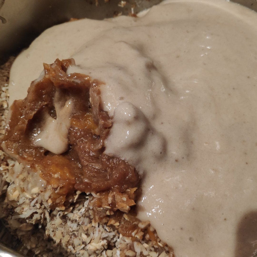 Смешиваем все ингредиенты до однородной массы. Я сначало смешала все сухие ингредиенты, потом добавила к ним сухофрукты и банан с медом и перемешала, так сухие ингредиенты более равномерно распределяются.