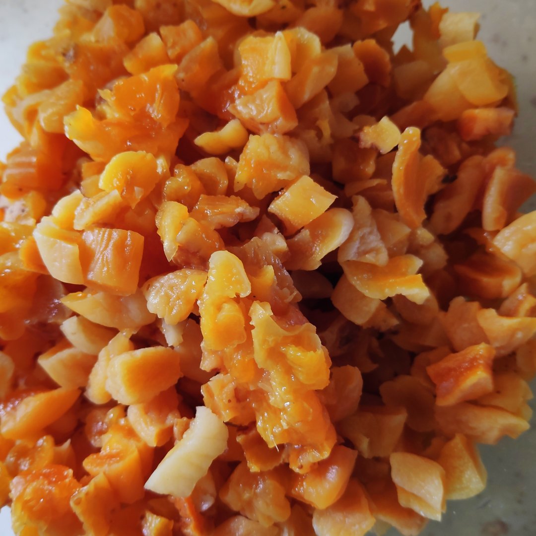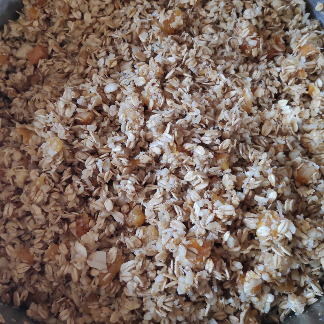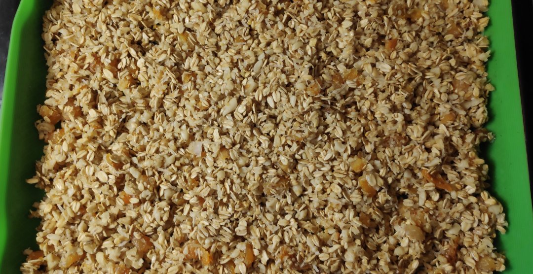 Курагу промываем, даем стечь лишней воде и нарезаем на кубики, что бы в граноле она была равномерно и небольшими кусочками. Отправляем к овсянке.