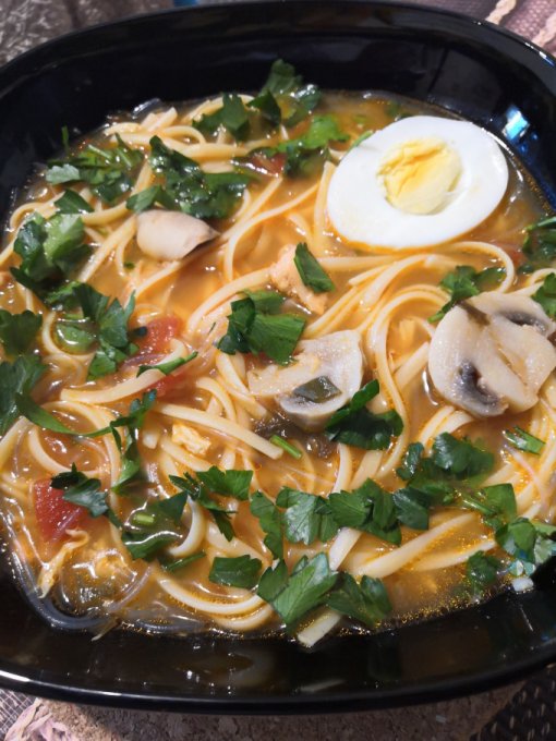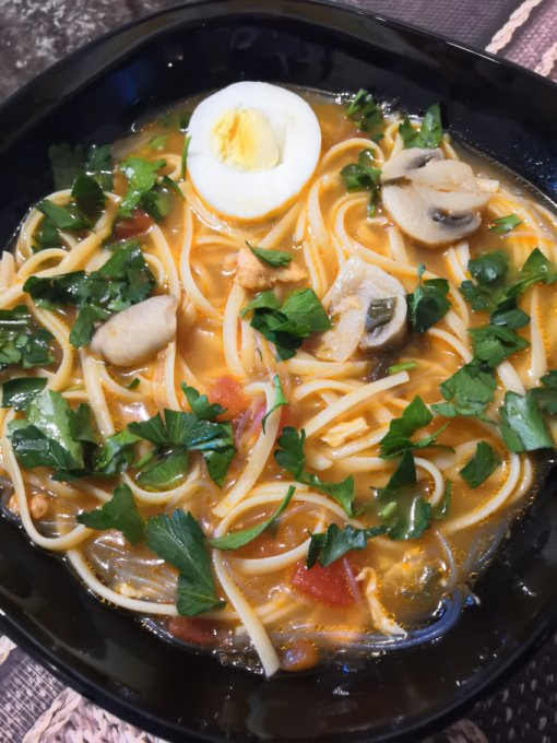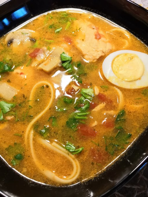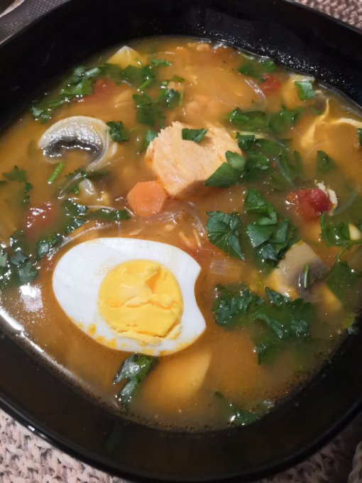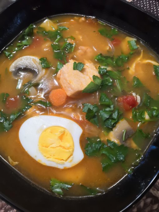 | Суп с лососем, креветками, фунчозой и грибами |