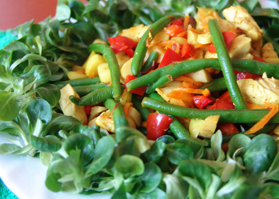 На тарелку выкладываем салат, куру с овощами, в конце перчим и