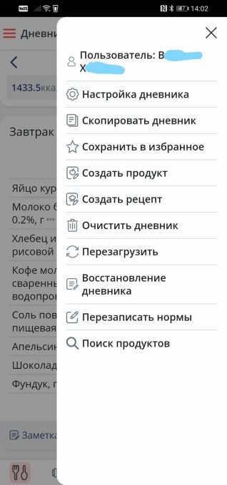 Её хорошо спрятали на телефоне. Дневник питания, затем три точечки справа: