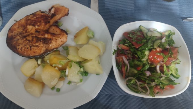 На завтрак - творожная запеканка с йогуртом и бананом, на обед - фаршированные перцы, десерт - шарлотка с яблоками и нектаринами и много фруктов, ужин - оливье с куриной грудкой. Чай с мятой и лимоном, как я люблю 🙂
