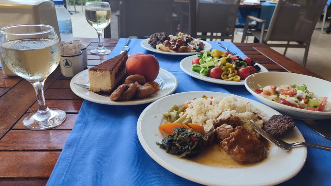 салат из овощей с греческим йогуртом. Иногда покупаем рыбу на