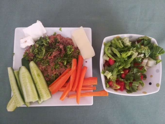 Сегодня держу себя в руках, рацион спланировала заранее, питательный и полезный. На фото завтрак традиционный египетский завтрак - бобы с оливковым маслом и тахиной (паста из кунжута), семенами льна и петрушкой, нарезка из овощей, сыр и салат из помидор и латука. Хлеб из рациона убрала, много калорий в маленьком кусочке, заменила на фрукты.