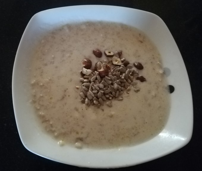 На завтрак - овсяная каша с семечками и фундуком, чай, ароматный свежесваренный кофе с молоком.