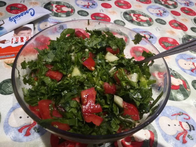 Потом получасовая пробежка перед ужином и скромный ужин - кефаль на гриле и большая тарелка овощного салата с зеленью. На вечерний перекус хурма и мандарины.