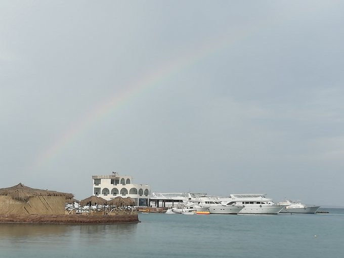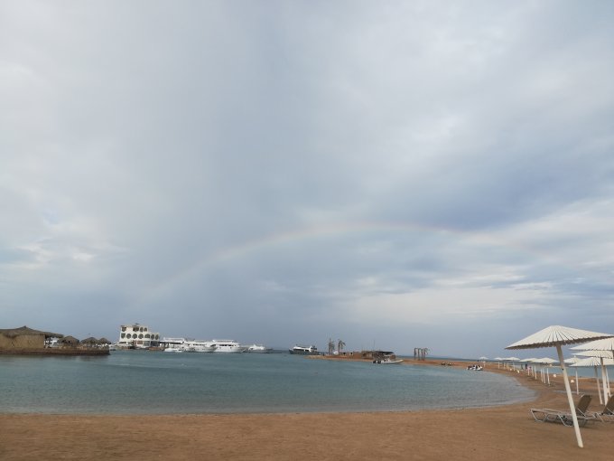 С утра по небу гуляли серые как дым облака, солнышко лишь изредка проглядывало среди них, а после обеда закапал мелкий летний дождик. И вдруг по небу растянулась волшебная радуга. Мы как раз гуляли по пляжу, так что удалось запечатлеть это чудесное явление природы.