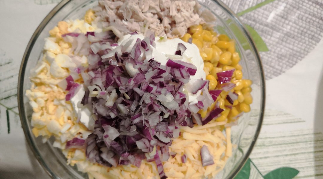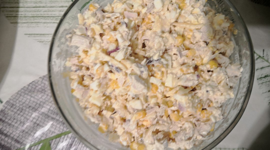 | Салат с курицей, кукурузой, яйцом и сыром |