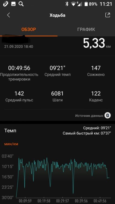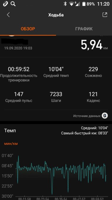данные с фитнес-браслета на 2 тренировки, получается что во время