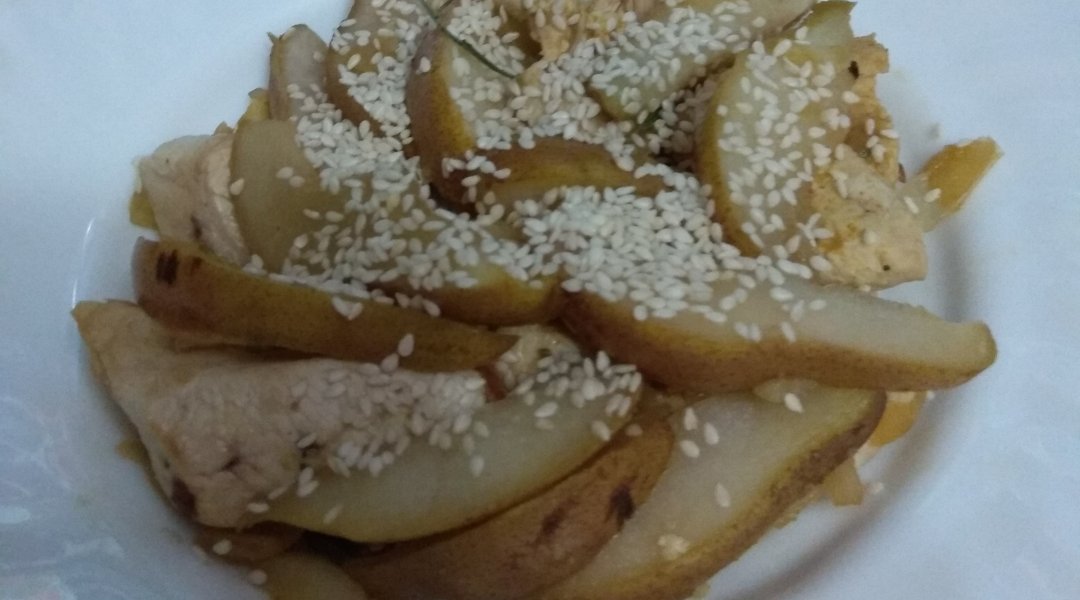 Индейку порезать крупными полосками,лук кубиками,грушу дольками.На одной сковороде обжарить лук до золотистого цвета,затем добавить индейку,посолить,поперчить и хорошо обжарить.Добавить 70г воды,убавить огонь.В другую сковороду добавить 30г воды и сахар,порезанную грушу,3шт.гвоздики и просушить до испарения жидкости на большом огне,непрерывно помешивая.Грушу достать переложить в сковороду,добавить розмарин и просушить все вместе несколько минут,чтобы все ингредиенты пропитали друг друга своим ароматом. Готовое блюдо выложили на тарелку и посыпали кунжутом.Приятного аппетита.