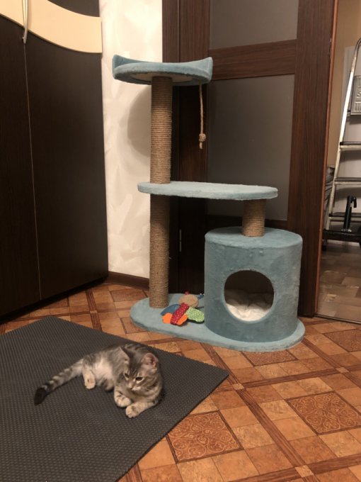 Спит в домике, на полочках играет. А вот когтеточку пока