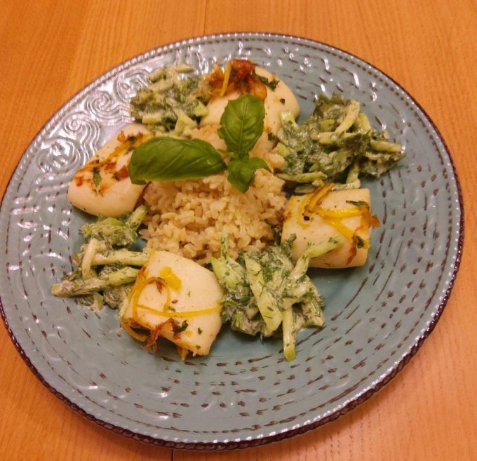 Кальмар жареный с базиликом и лимонной цедрой, бурый рис и салат из огурца с зеленью и йогуртовой заправкой.