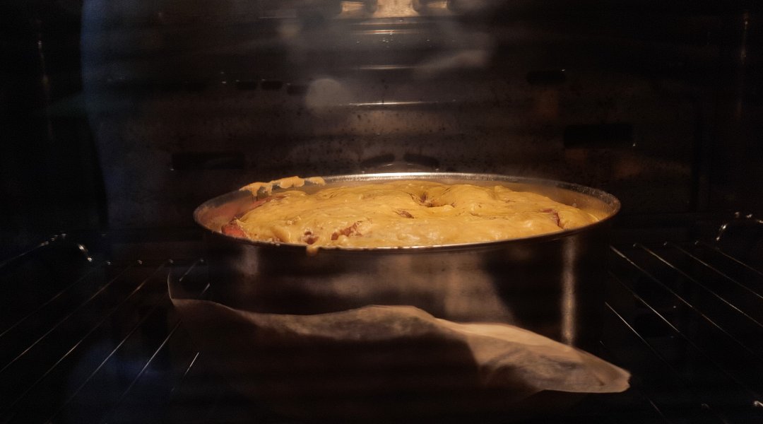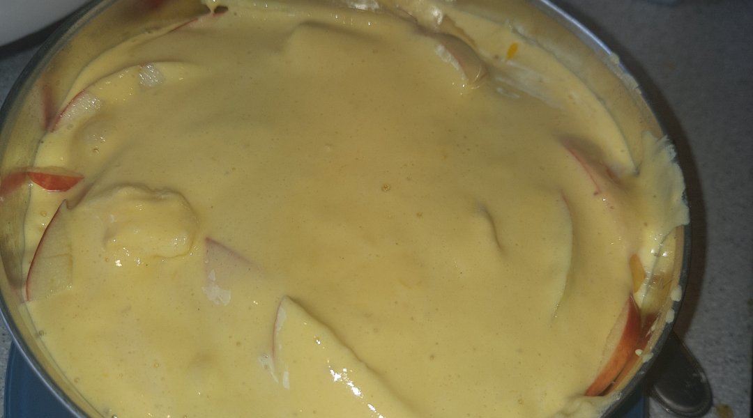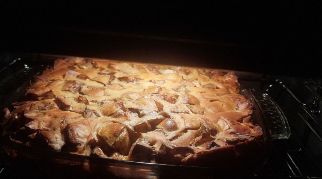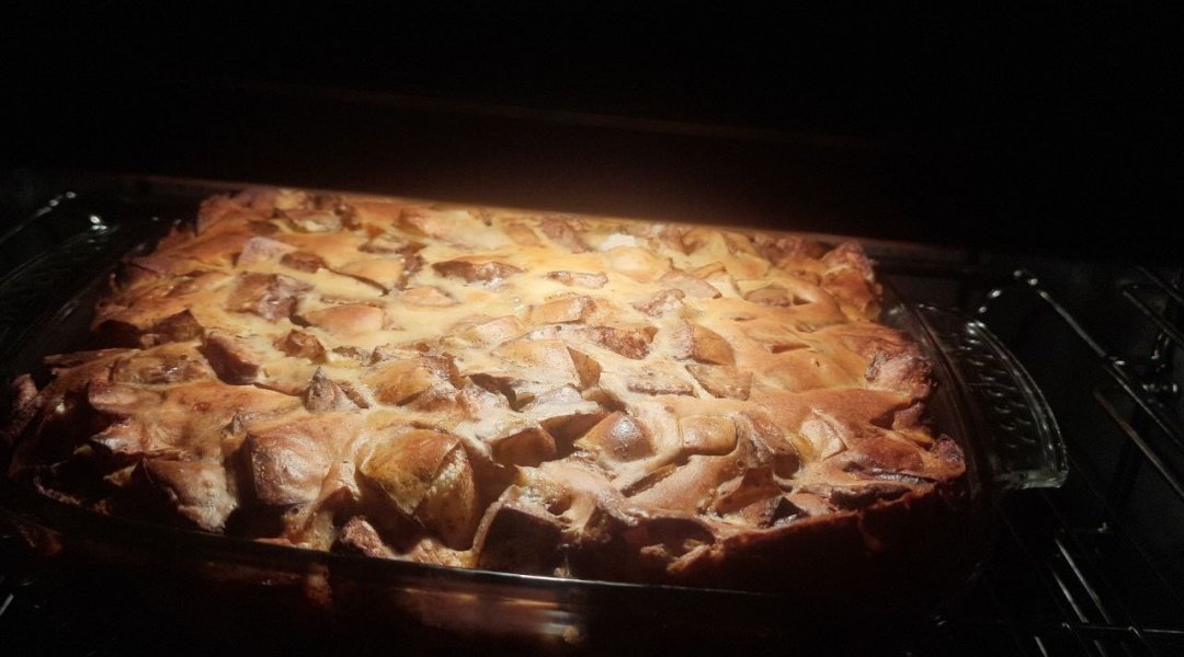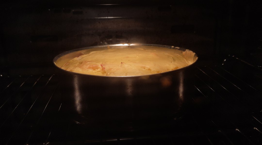 Противень или форму разогреть, смазать маслом, на него вылить 1 часть, получившегося теста, на него выложить яблоки, сверху залить еще раз тестом. Ставим в духовку выпекаться на режим верх-низ без конвекции при температуре 180 градусов около 30-40 минут, в зависимости от размера формы. Готовность проверяем деревянной шпажкой.