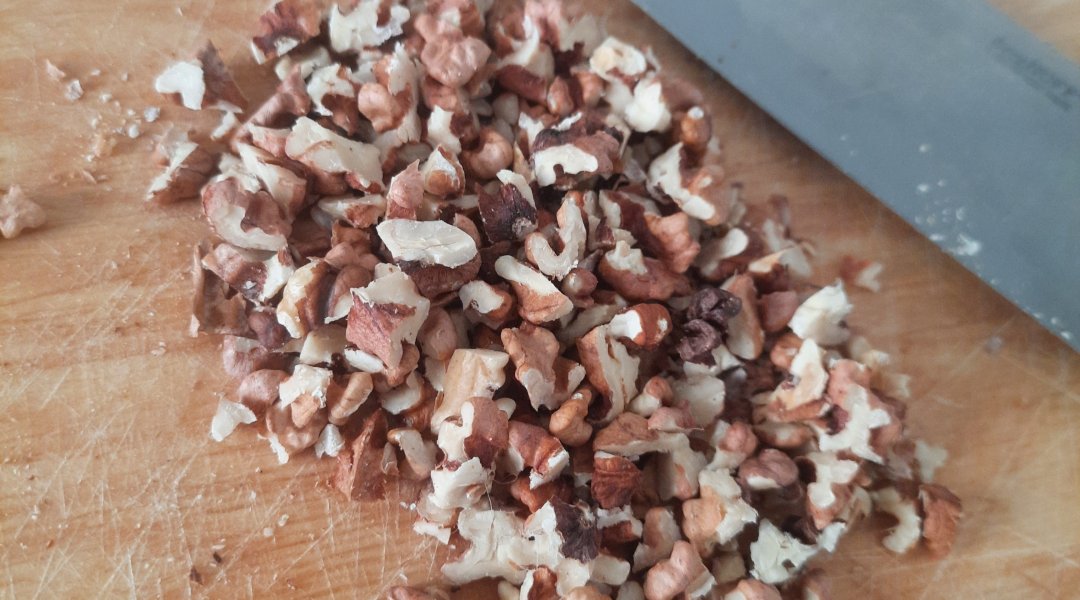 Чернослив, изюм замачиваем а затем обсуждаем, чернослив нарезаем, если изюм большой, то и его тоже. Орехи слегка поджарить на сковороде или в микроволновке, порубить ножом