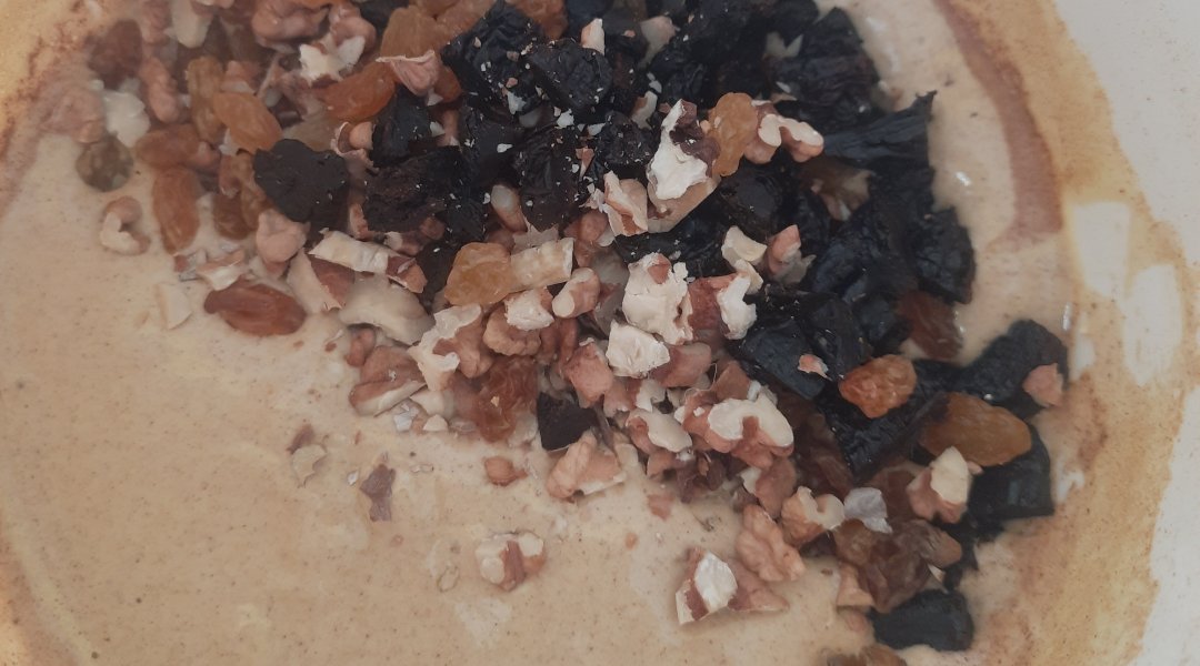 Убираем миксер, добавляем в почти тесто орехи, изюм, чернослив