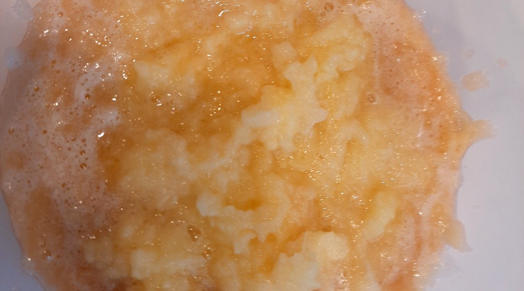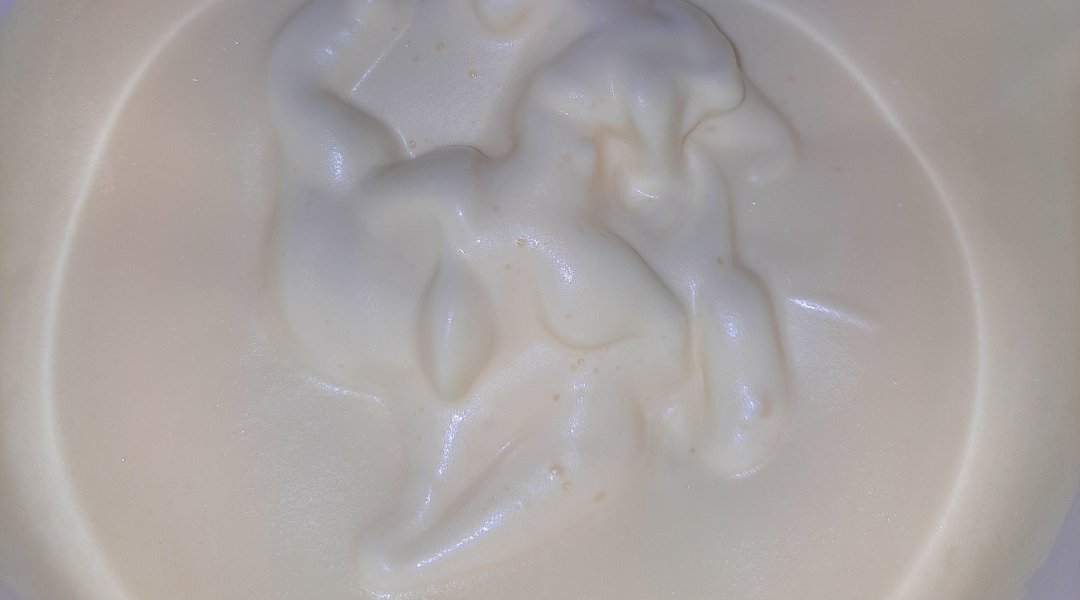 Во взбитую массу добавить ряженку или сметану, у меня были остатки и того и другого, в принципе наверное они друг друга заменяют. Всего общая масса около 400 граммов. Все еще раз взбить.