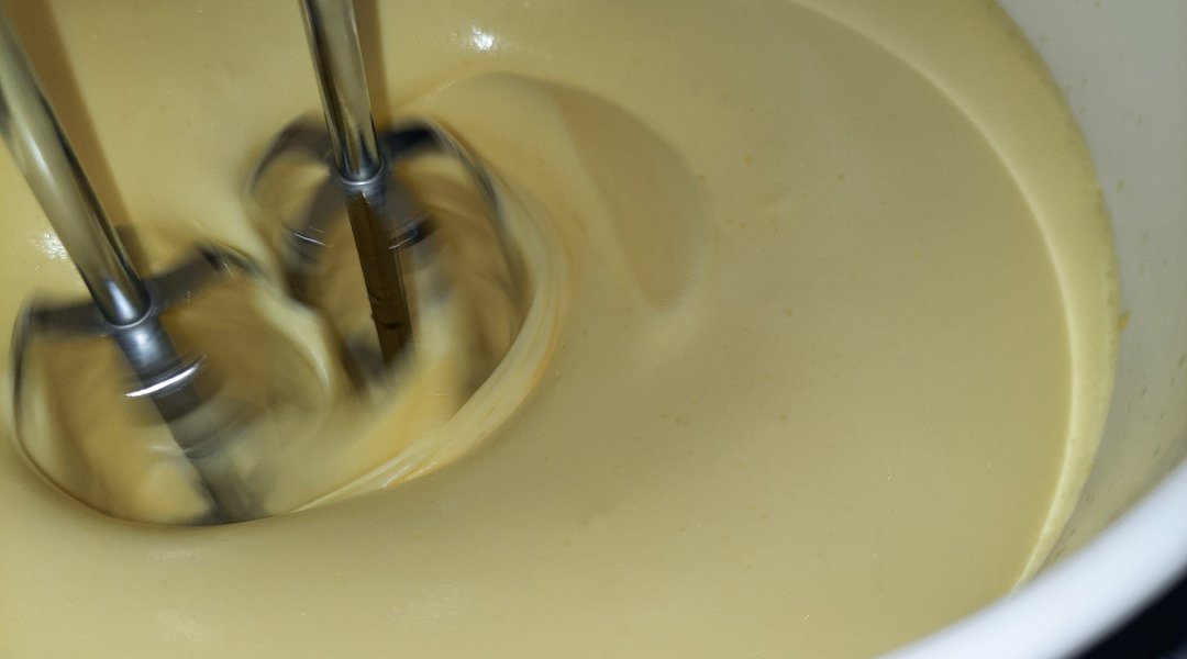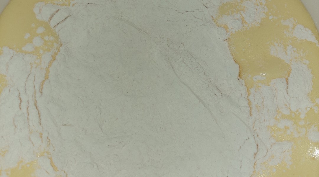 Муку смешать с разрыхлителем и добавить во взбитую массу, продолжая взбивать до однородности.