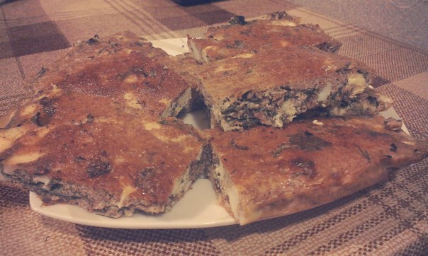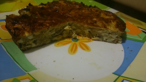 в специальную форму или противень, выстланный фольгой выливаем примерно 1\3 теста (чтобы только скрыло дно формы), затем равномерно выкладываем на этот слой начинку и сверху вновь заливаем все остатками теста |