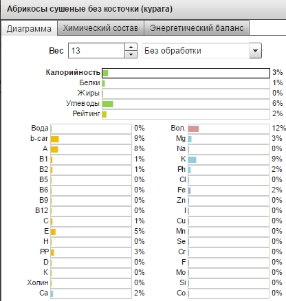 Курага - 3% дневной нормы калорий, 0 % жиров, 6% углеводов, 1%