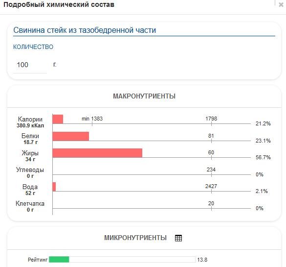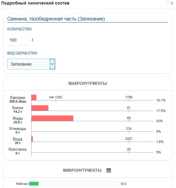 Вы выбрали: Свинина, тазобедренная часть - у нее высокая калорийность, 305 кк. Бывают постные куски без жира, у них другая калорийность. Например свиная вырезка всего 142 кк.