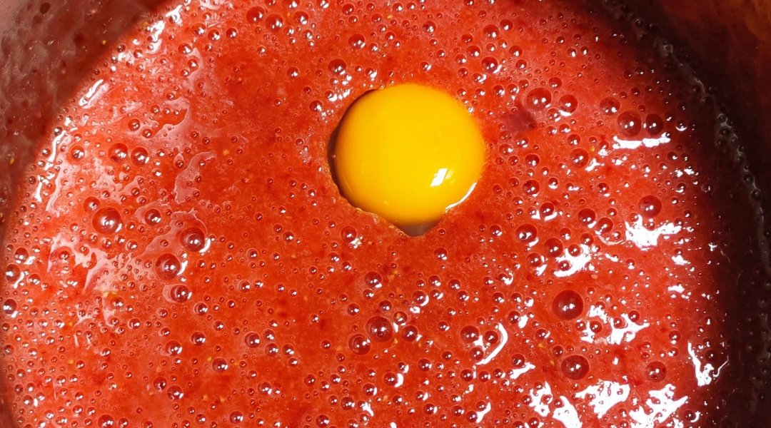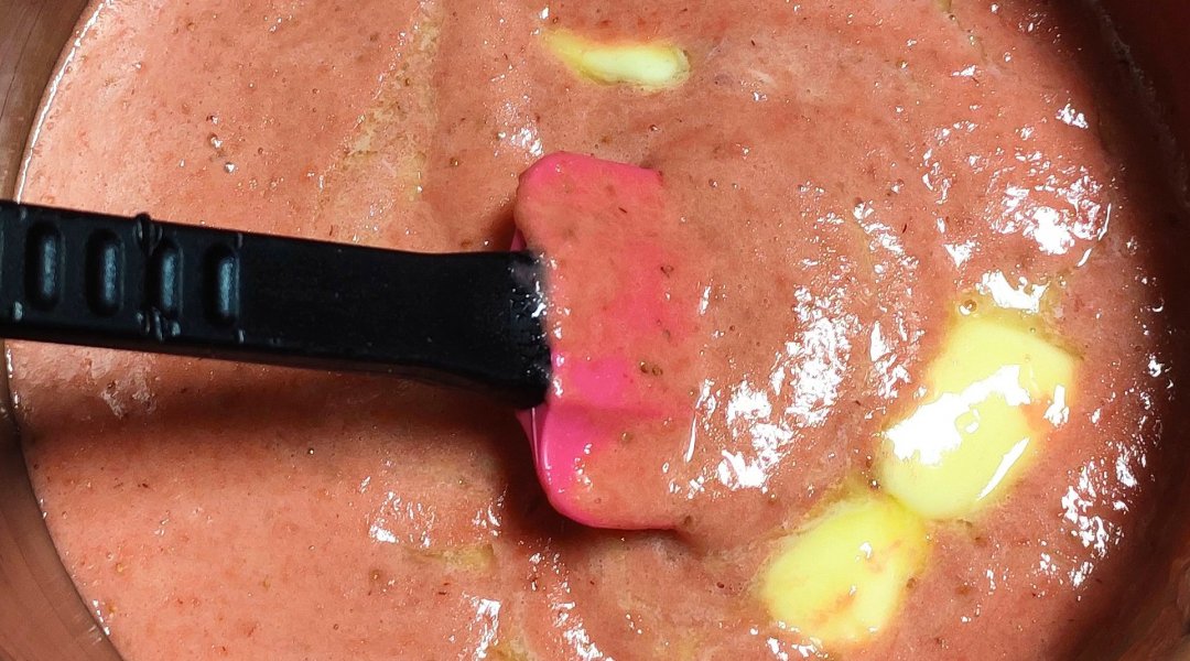 Клубнику перемолоть в пюре блендером. Добавить сок, крахмал и желток. На медленном огне варить до желаемой густоты. Снять с огня и добавить масло. Перемешать. Готово