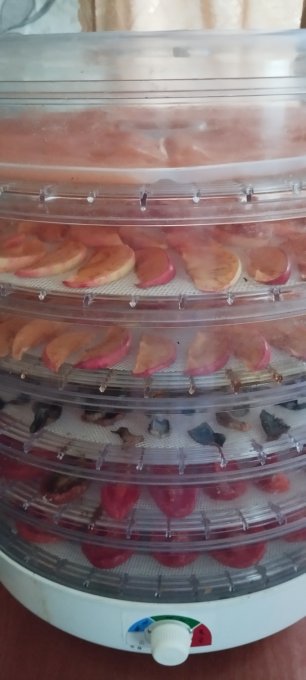 Утром собрала помидоры ,выдернула кусты на грядке в открытом грунте. Принесла домой, нарезала помидоры и поставила 2 поддона в сушилку.Понравились вяленые с розмарином и оливковым маслом. Жаль стало электричество гонять: пошла в лес. Грибов считай нет. Не смотря на дождики жара свое взяла.Вернулась в 8.30,почистила ,порезала, как раз поддон поставила. Подумала и нарезала 2 поддона яблок- туда же. Посмотрела на оставшиеся яблоки и последний поддон ,и приготовила пастилу немного, как раз всё заполнила. Грибы быстро-быстро уже убрала в стакан от махеевского джема. На подходе яблоки, а помидоры с пастилой боюсь до ночи. Мимоходом сделала соус томатный и 1.5 л банку черри в томате, сварила мужу суп, запекла капусту с куриными ножками и приготовила хачапури. Всё. Поужинали, можно и кино посмотреть. Стала всё вбивать.... Ужас