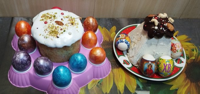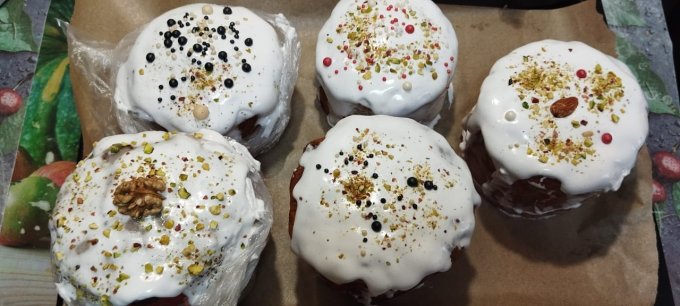 Вчера испекла куличи :1 кето,2 творожных,2 воздушных дрожжевых,как панетоне. Сделала маковую начинку на рулет и успокоилась. Сегодня с утра побежала в Валдберис куртку мерить,потом сготовила обед,замесила тесто на рулет и пошли с мужем парники накрывать. Накрыли,идём домой и я вспоминаю про тесто.Прихожу оно через край:-o . Дальше хуже.Сделала рулет,а тесто перестоялось,косички не плетутся! Поставила на расстойку этого монстра,а пока занялась желатиновой глазурью-куличи же головые,ровненькие красивые ждут.Ага ждите,сейчас вас изуродуют.Короче открыла новую пачку проверенного годами желатина с Валдберис,а он крупноватый и не хочет набухать.Пока его ждал ,рулет ещё перестоял.Когда поставила печь , стала поливать куличи,а глазурь ползёт вниз! :crazy: Пока правила её,рулет поджарился.Это был уже пирог какой-то на весь противень. Муж даже снял такой позор:help:  тут  наконец-то покрыла куличи,а с украшениями и связываться не стала . Всё.