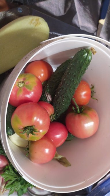 Младшенькая дочка пошла на элиминационную диету-хочет узнать на какие продукты прыщи,а то она скоро не сможет продолжить своё веганство.Ну а раз так,запекла ей козлятину ,заодно кусочек съела сама.15 лет не ела-соскучилась.Баранина это не то. День у меня получился какой-то кофейный:oops: .Но прям трясло хотелось кофе. Вот решила прислушаться к зову организма. Жара на улице продолжается. В квартире 26,на улице в тени 30. С утра нарвала ведёрко огурцов,к вечеру помидорок немного и ещё огурков. С приходом жары они хоть спеть начали