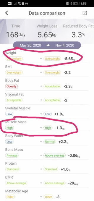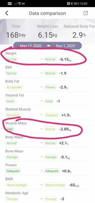Я думала, что у весов тупой алгоритм, и они всегда показывают одинаковое соотношение потери мышц и жира, ан нет. Может, конечно, дело в том, что он мужчина, а я женщина, и у нас изначально был разный процент жира и мышц. Так что алгоритм всё-таки не самый умный. А, может, я что-то правильно делаю и правда теряю мышц меньше.