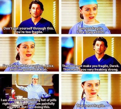- Я не хрупкая, я наркоман. Я дважды слетела с катушек, и я поднялась на ноги. Это не делает тебя хрупкой, Дерек, это делает тебя чертовски сильной. Я стою в здании полном таблеток прямо сейчас. Факт, осознание которого причиняет мне боль. Но я делаю это. Это – не хрупкость.