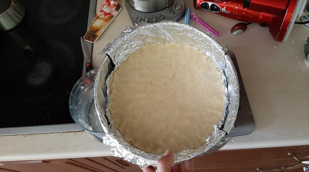 Смешать все ингредиенты для коржа: 50 гр. размягченной мякоти