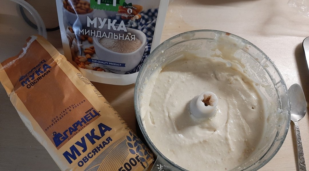 Добавить 50 гр. миндальной муки, 50 гр. овсяной муки и кукурузный
