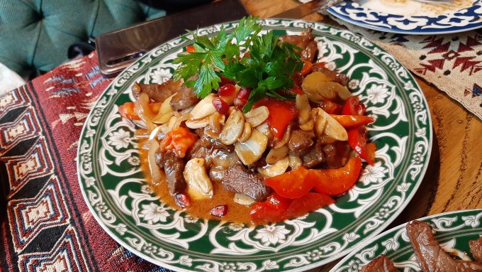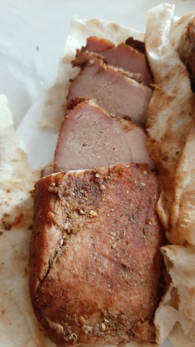 | Свинина, стейк из окорока, без костей, мясо с жиром, жареная на огне |