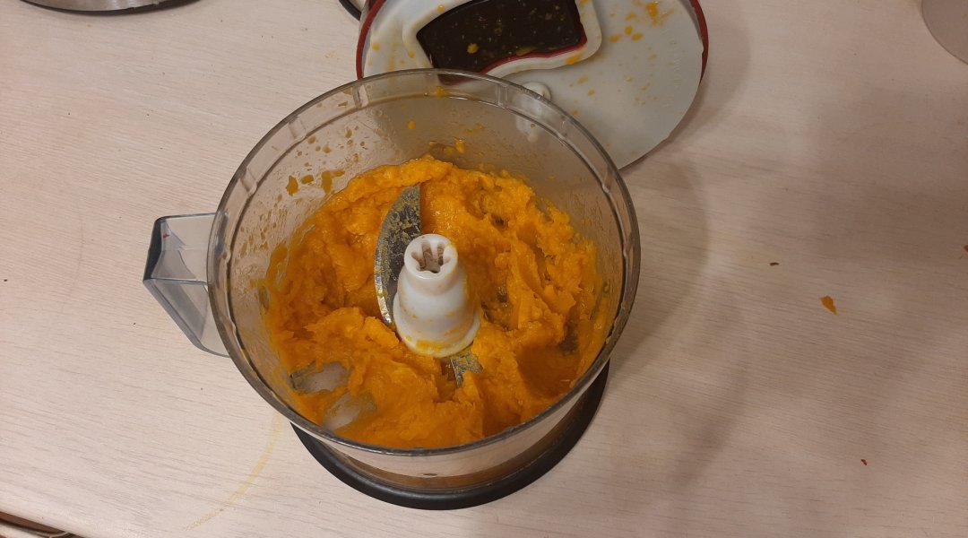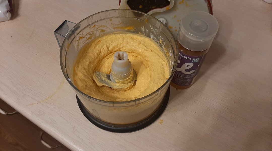 Перебить мягкую тыкву с облепиховым соком до состояния пюре в