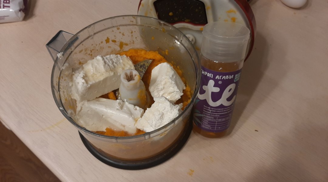 К тыквенному пюре добавить 200 гр. творога и 1 ст.ложку (16 гр)