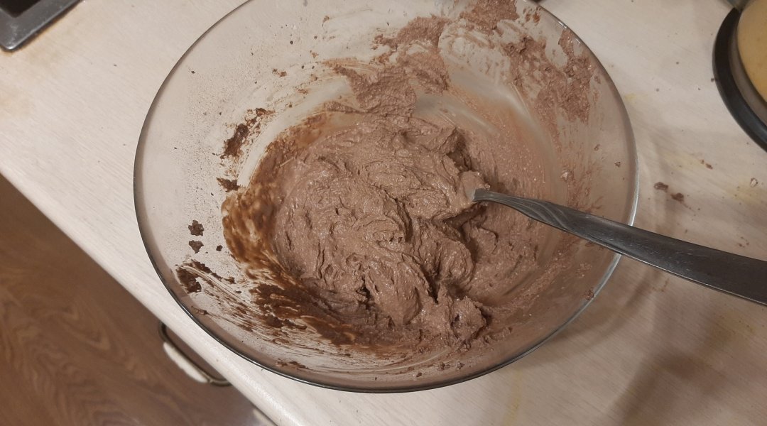 Смешать в отдельной миске 200 гр. творога, какао порошок, 16 гр.