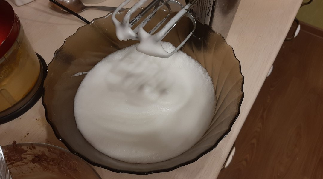 Взять 3 яйца, отделить белки от желтков. Белки взбивать миксером в